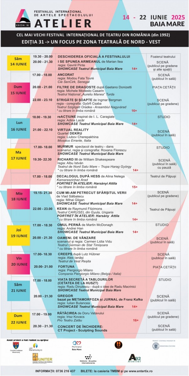 Teatrul Municipal Baia Mare organizează, în perioada 14 – 22 iunie 2024, cea de-a 31-a ediţie a Festivalului Internaţional de Artele Spectacolului ATELIER.